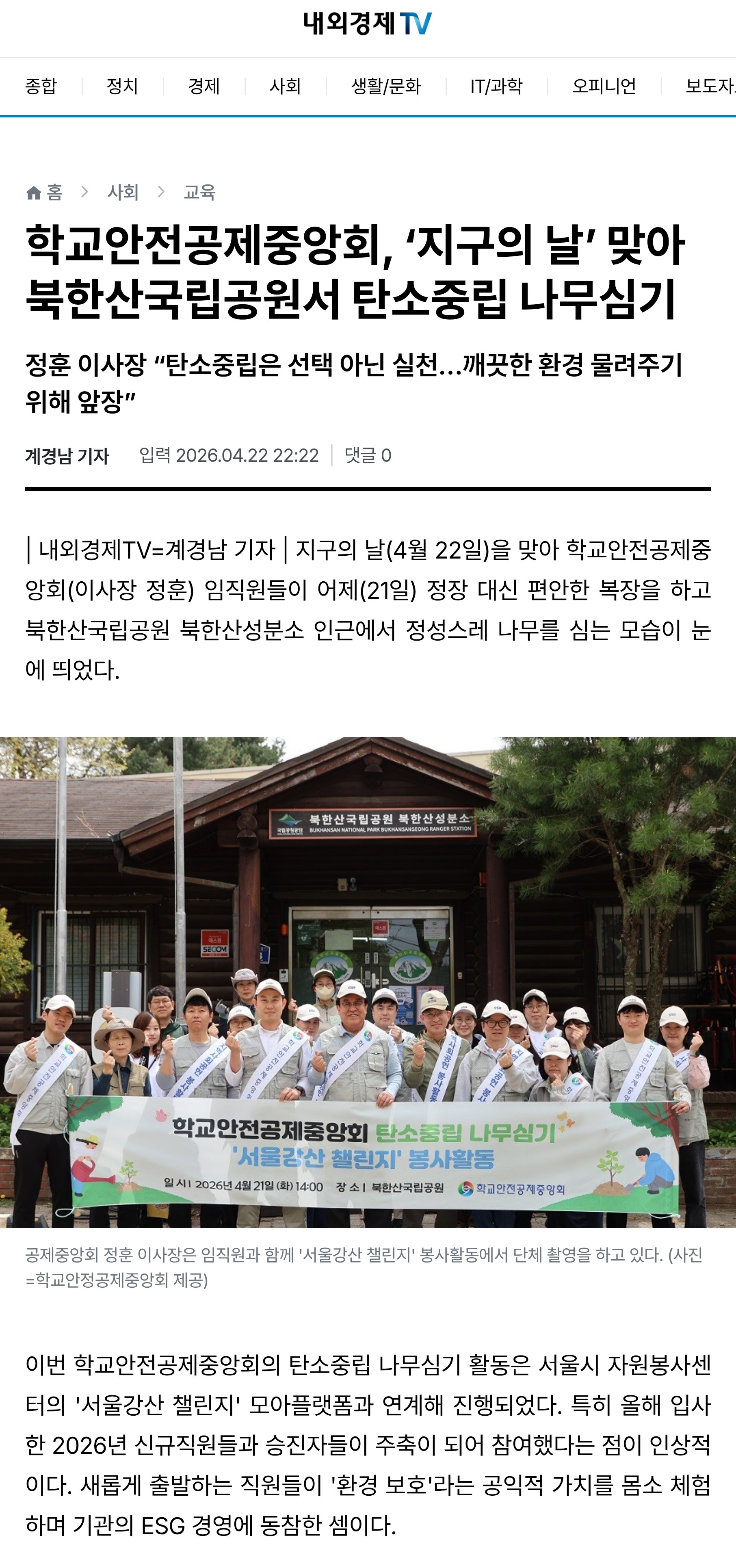 □ [내외경제TV] (2026.04.22.) 학교안전공제중앙회, ‘지구의 날’ 맞아 북한산국립공원서 탄소중립 나무심기 https://www.nbntv.co.kr/news/articleView.html?idxno=4020995