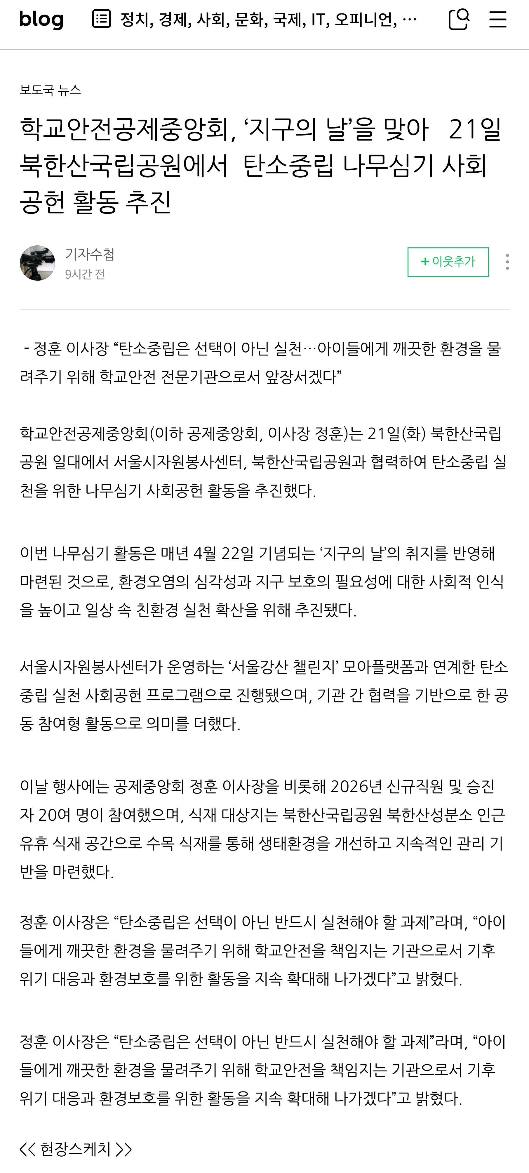 □ [기자수첩] (2026.04.27.) 학교안전공제중앙회, ‘지구의 날’을 맞아 21일 북한산국립공원에서 탄소중립 나무심기 사회공헌 활동 추진 https://m.blog.naver.com/enhanok70/224266133437